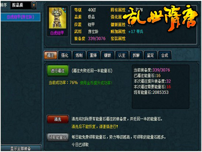 灌注:玩家可以通过消耗能量石而有几率成功提升装备的装备度,如果灌注失败系统会自动返还一半的能量石。