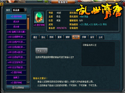 认主:认主功能是这次《乱世隋唐》新版本的一大亮点,所指的内容玩家可以在将领界面选择穿戴的装备进行装备认主,认主之后可以增加5点力量并同时提升20%的装备度上限。不过需要注意的就是认主的装备只能由被认主的将领穿戴,如果想要其他将领穿戴这件装备的话,那么就需要解除装备认主之后再给其他将领穿戴。