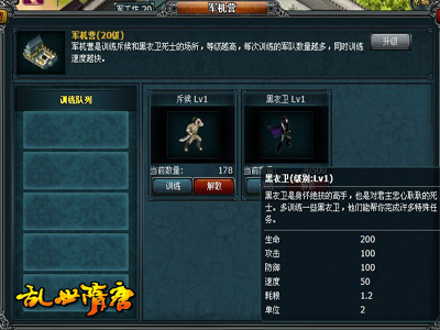 在《乱世隋唐》之中,军机营除了以上这些公用之外还是黑衣卫的摇篮。这些由君主训练出来的死士,将在军机营中诞生并直接听命于君主本人。他们将会与其他城池的黑衣卫死战到底,而目的只是为了达到君主所要求的终极目标!