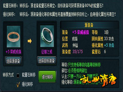 转移强化等级时,转移的成功率是100%的,所以玩家大可放心。强化等级转移必须在同类型装备间才可以执行,而且每次转移是免费的哦。